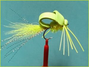 His favorite top water bass fly is the ‘stealth bomber’. The stealth bomber was developed by Georgia fly fishing guide, Kent Edmonds in the early 1990’s . It is an easy fly to tie and does not use any exotic materials. Its unique action and bubble trail is a deadly attractor for bass, pike, bluegill, and most warm water species.